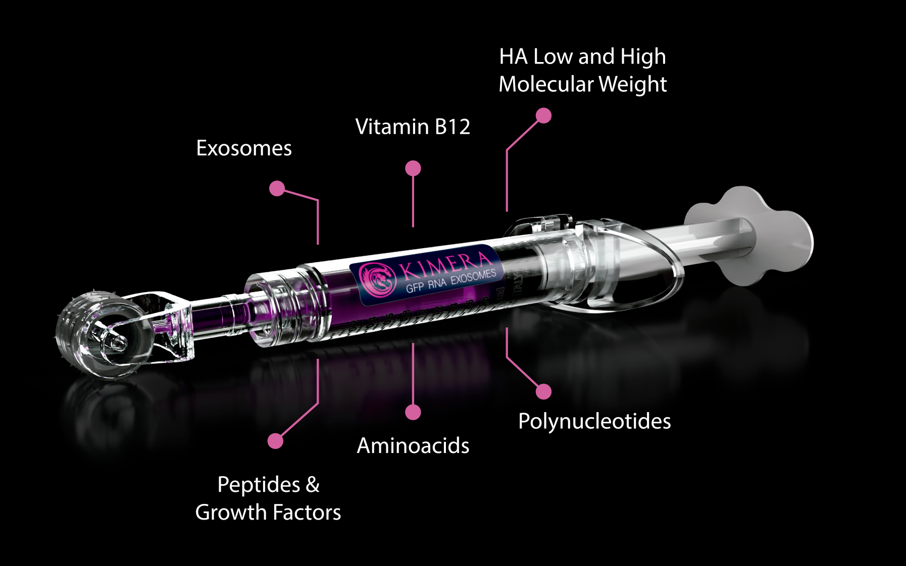 Is a pink solution, in the form of a purified gel based on low molecular weight and high molecular weight hyaluronic acid combined with exosomes, growth factors, peptides, nucleotides, amino acids and vitamins. Moisturizing and biostimulating action on the skin, whitening action, reduction of hyperpigmentation, reduction of acne scars, control of excess sebum.